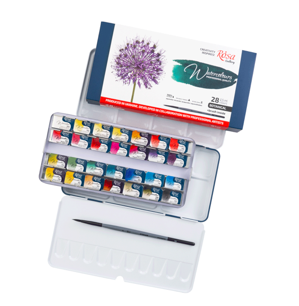 Набір професійних художніх акварельних фарб Botanical на 28 кольорів призначений для поціновувачів ботанічної ілюстрації. Повітряність та багатошаровість, що властиві ботанічній ілюстрації, забезпечуються прозорістю акварельних фарб. Чистота у сумішах досягається домінуванням у палітрі однопігментних кольорів. Набір професійних художніх акварельних фарб Botanical від ROSA Gallery поєднав у собі саме ці властивості.