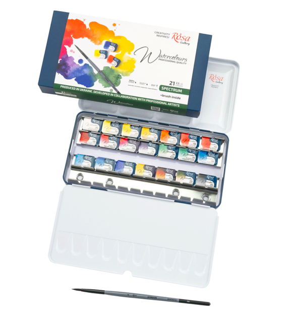 - Завдяки невеликому розміру пенал можна переносити у сумці або етюднику Завдяки стильному дизайну обгортки та металевому пеналу з кришкою-палітрою набори акварельних фарб ROSA Gallery в кюветах стануть вишуканим подарунком для професійного художника.