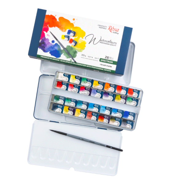 Набір професійних художніх акварельних фарб SPECTRUM на 28 кольорівпоєднує у собі традиційні кольори для техніки акварель. більшість кольорів гами - однопігментні, що дає можливість утворювати чисті віддінки при зммішуванні.