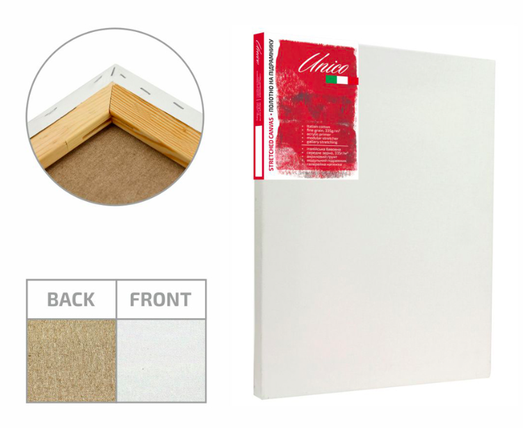 Середньозернисте полотно (335 г/м2) ідеальне для робіт виконаних як з допомогою пензля так і мастихіна.