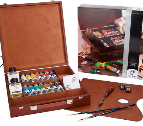 Якщо ви шукаєте кращий колір олії, ця колекція олійних олій голландського виробництва Van Gogh саме для вас. Масляниста олія з чудовою тонуючою здатністю, високим рівнем пігментації для інтенсивних кольорів, рівномірним блиском і густотою кольорів, а також світлостійкістю від хорошої до відмінної. Легко змішується та використовується. Ці олії чудово підходять для початківців, студентів, які вивчають глибші методи, та працюючих художників. Цей загальний набір для натхнення підбору кольорів містить 14 тюбиків по 40 мл у таких кольорах: титановий білий (105), азо-жовтий лимонний (267), азо-жовтий середній (269), азо-червоний світлий (312), азо-червоний насичений (313), хінакридоновий рожевий (366), блакитний фтало (535), севрський блакитний (530), смарагдово-зелений (623), смарагдово-зелений (615), ультрамариновий (504), жовта охра (227), палена умбра (409), колір слонової кістки чорний (701). Цей дерев'яний набір також містить: уайт-спірит без запаху Talens 75 мл, малярний засіб Talens 75 мл, плоский художній пензель зі щетиною свині (розмір 10), круглий художній пензель зі щетиною свині (розмір 6), малярський ніж, чашку з подвійною палітрою, дерев'яну палітру, серветку для чищення та брошуру зі змішування кольорів.