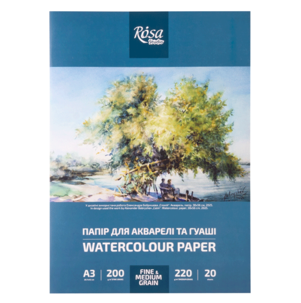 Папір виготовлений зі 100% європейської целюлози та має щільність 220–200 г/м², що забезпечує надійну поведінку під час роботи з водними техніками. Спеціальна проклейка дозволяє фарбі рівномірно розтікатися, зберігає глибину кольору та запобігає просочуванню на зворотну сторону. Папір витримує до 7 стирань без деформацій — важлива перевага для учнів та художників, які активно відпрацьовують техніку.