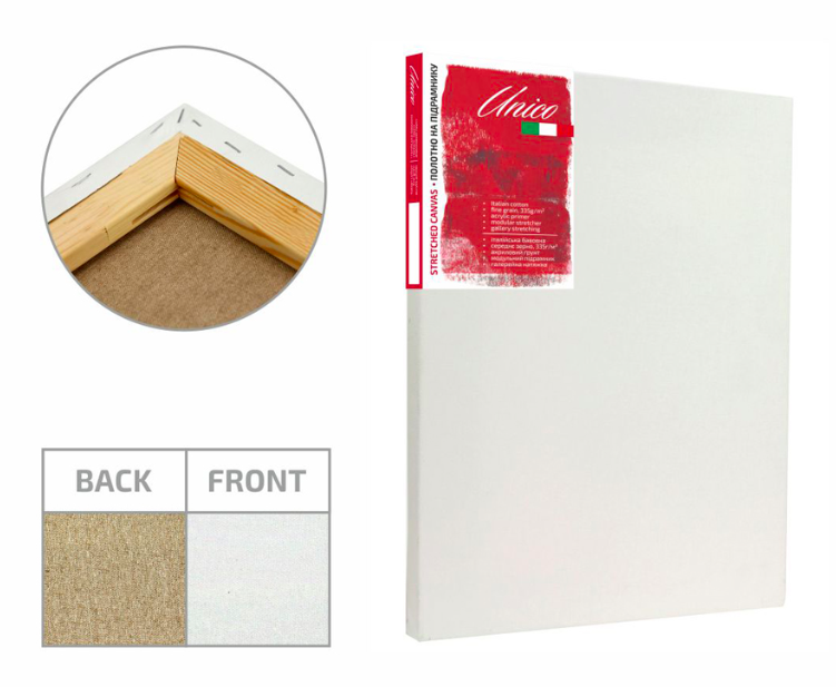 Якісний акриловий грунт ідеально підходить до будь-яких видів фарб, а модульний підрамник що розклинюється (19х45мм) дозволить легко регулювати натяжку полотна. Тонований зворотній бік придає полотну вишуканого вигляду.