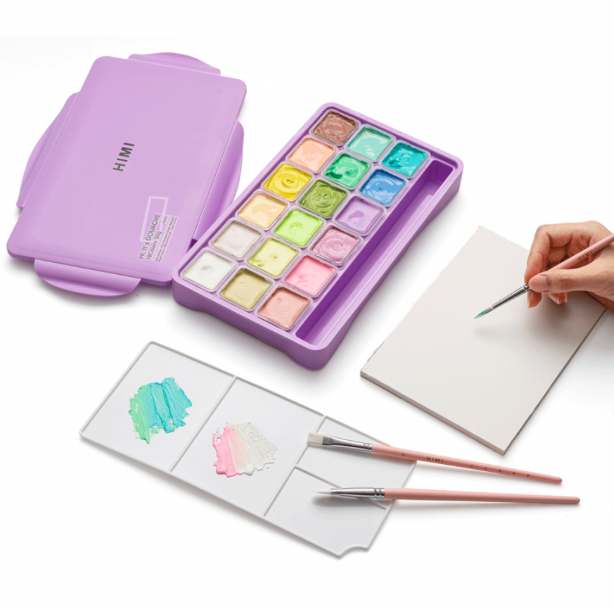 Відкрийте капсулу Jelly Cup і візьміть фарбу пензлем або мастихіном. Для яскравішого результату використовуйте гуаш без розведення. Якщо бажаєте створити легкі відтінкові переходи, додайте кілька крапель води. Після завершення роботи закрийте пенал, щоб зберегти свіжість і текстуру фарби. Гуаш HIMI легко відмивається з інструментів і не має запаху — зручно навіть для тривалих творчих сесій.