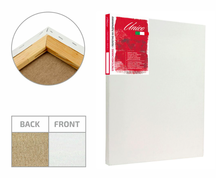 Якісний акриловий грунт ідеально підходить до будь-яких видів фарб, а модульний підрамник що розклинюється (19х45мм) дозволить легко регулювати натяжку полотна. Тонований зворотній бік придає полотну вишуканого вигляду.