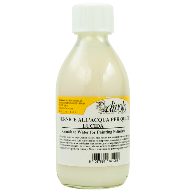 Глянцевий лак на водній основі для картин – це суміш води та акрилових смол, яка після висихання утворює прозору, міцну, глянсову плівку. Ідеально підходить для нанесення на картини, як олійні, так і акрилові, використовується як фінішне покриття для декорованих поверхонь у різних техніках.