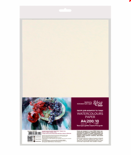 Папір акварельний ROSA Studio дрібнозернистої текстури зі щільністю 200 г/м2, який підходить для усіх базових технік акварелі та гуаші.