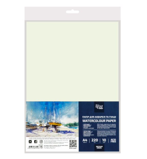Завдяки спеціальній внутрішній та поверхневій проклейці фарби рівномірно розтікаються, зберігають глибину кольору та не проходять на зворотний бік. Папір добре витримує багаторазові поправки та до 7 циклів стирання без втрати структури — чудовий вибір для навчання й практики. Обирайте зручний для Вас спосіб упакування акварельного паперу - пакети на 10 та 20 аркушів чи папки на 10 та 20 листів. В додаток до асортименту ROSA створили папки та пакети для художників, які полюбляють експериментувати з фактурами паперу - Мікс паперу для акварелі: середнє нове + дрібне зерно, вже добре знайомий вам папір ROSA Studio. Не потрібно шукати різні текстури паперу поштучно, тепер в одному наборі поєднані два типи зернистості для різних творчих завдань. Надихайтеся чудовими картинами українських художників Василя Когутича та Олександра Бобришева, які прикрашають обкладинки нових папок і пакетів для акварелі та допомагають швидко впізнати потрібний продукт.