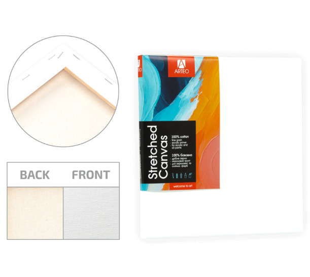 Полотно на підрамнику ARTEO виготовлене зі 100% натуральної бавовни щільністю 280 г/м² не провисає та зберігає ідеальний натяг. Еластичний акриловий ґрунт та дрібне зерно полотна забезпечують легке нанесення фарби, дозволяють виконати як детальні, так і фактурні мазки. Завдяки галерейній натяжці, коли скоби розміщені на звороті підрамника створюється ефект безрамкового зображення, що дозволяє розмістити картину в декорі відразу після висихання фарб, не турбуючись про раму. Модульний підрамник, виготовлений з міцної якісно висушеної клеєної деревини, добре тримає форму. Полотна на підрамнику виготовляються в розмірах від 15х15см до 80х100 з інтервалом в 5см.