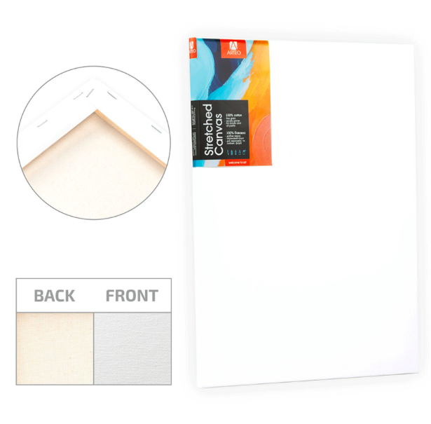 Полотно на підрамнику ARTEO виготовлене зі 100% натуральної бавовни щільністю 280 г/м² не провисає та зберігає ідеальний натяг. Еластичний акриловий ґрунт та дрібне зерно полотна забезпечують легке нанесення фарби, дозволяють виконати як детальні, так і фактурні мазки. Завдяки галерейній натяжці, коли скоби розміщені на звороті підрамника створюється ефект безрамкового зображення, що дозволяє розмістити картину в декорі відразу після висихання фарб, не турбуючись про раму. Модульний підрамник, виготовлений з міцної якісно висушеної клеєної деревини, добре тримає форму. Полотна на підрамнику виготовляються в розмірах від 15х15см до 80х100 з інтервалом в 5см.