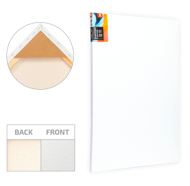 Полотно на підрамнику ARTEO виготовлене зі 100% натуральної бавовни щільністю 280 г/м² не провисає та зберігає ідеальний натяг. Еластичний акриловий ґрунт та дрібне зерно полотна забезпечують легке нанесення фарби, дозволяють виконати як детальні, так і фактурні мазки. Завдяки галерейній натяжці, коли скоби розміщені на звороті підрамника створюється ефект безрамкового зображення, що дозволяє розмістити картину в декорі відразу після висихання фарб, не турбуючись про раму. Модульний підрамник, виготовлений з міцної якісно висушеної клеєної деревини, добре тримає форму. Полотна на підрамнику виготовляються в розмірах від 15х15см до 80х100 з інтервалом в 5см.